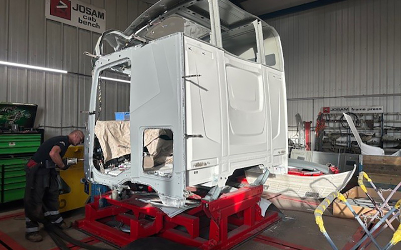 Our JOSAM System also includes chassis re-alignment and cab jig facilities. The re-alignment system is an integral piece of equipment which once again benefits from laser technology and the overall outcome of our accident repair projects. The floor-based system operates using a series of press trolleys locked into a frame, which hold and apply pressure at specific points in order to return the chassis to its pre-accident state.
